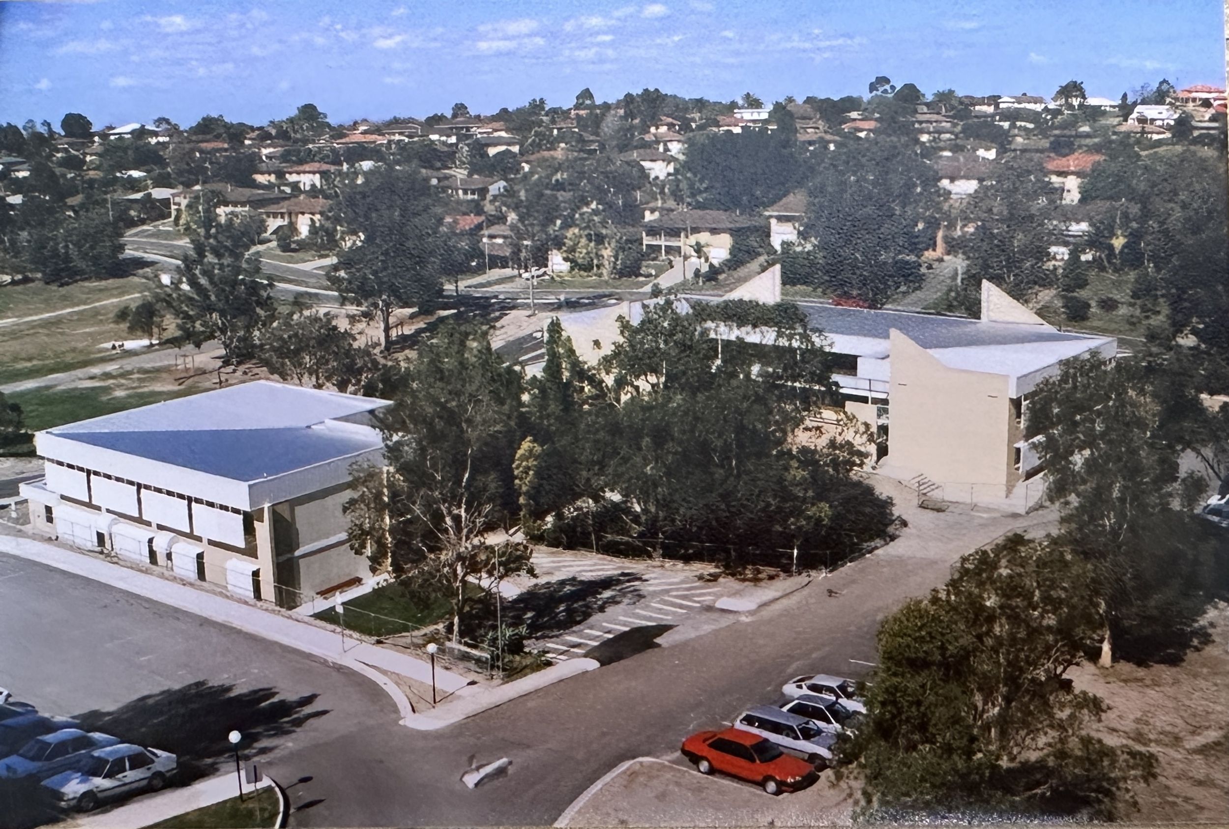 When the first half of the church was built in 1976, the property was the single block of land with the road in from Flockton St situated on the western side of the church, going up past where the Main College office now sits, and up the hill to the church. It was not until 1994 that the road was moved to the current side, after the purchase of the third block of land – where the CINC building and the oval are now situated.