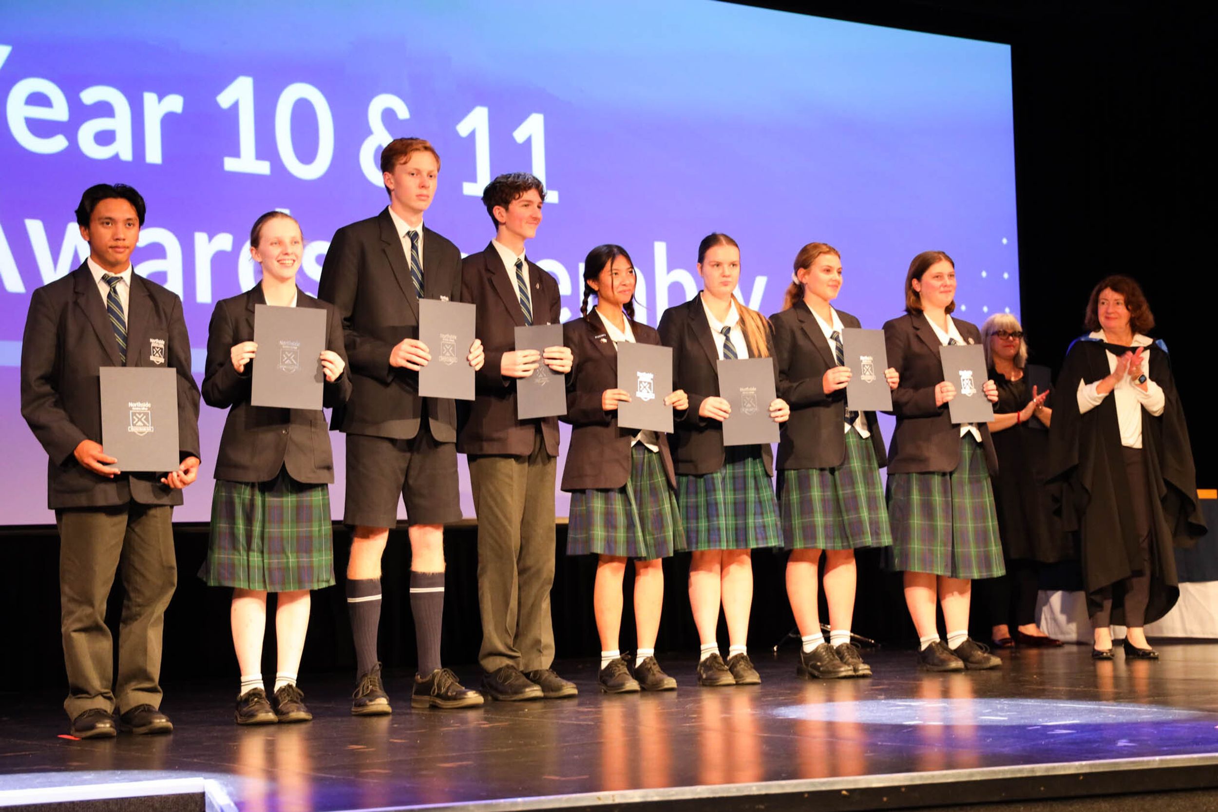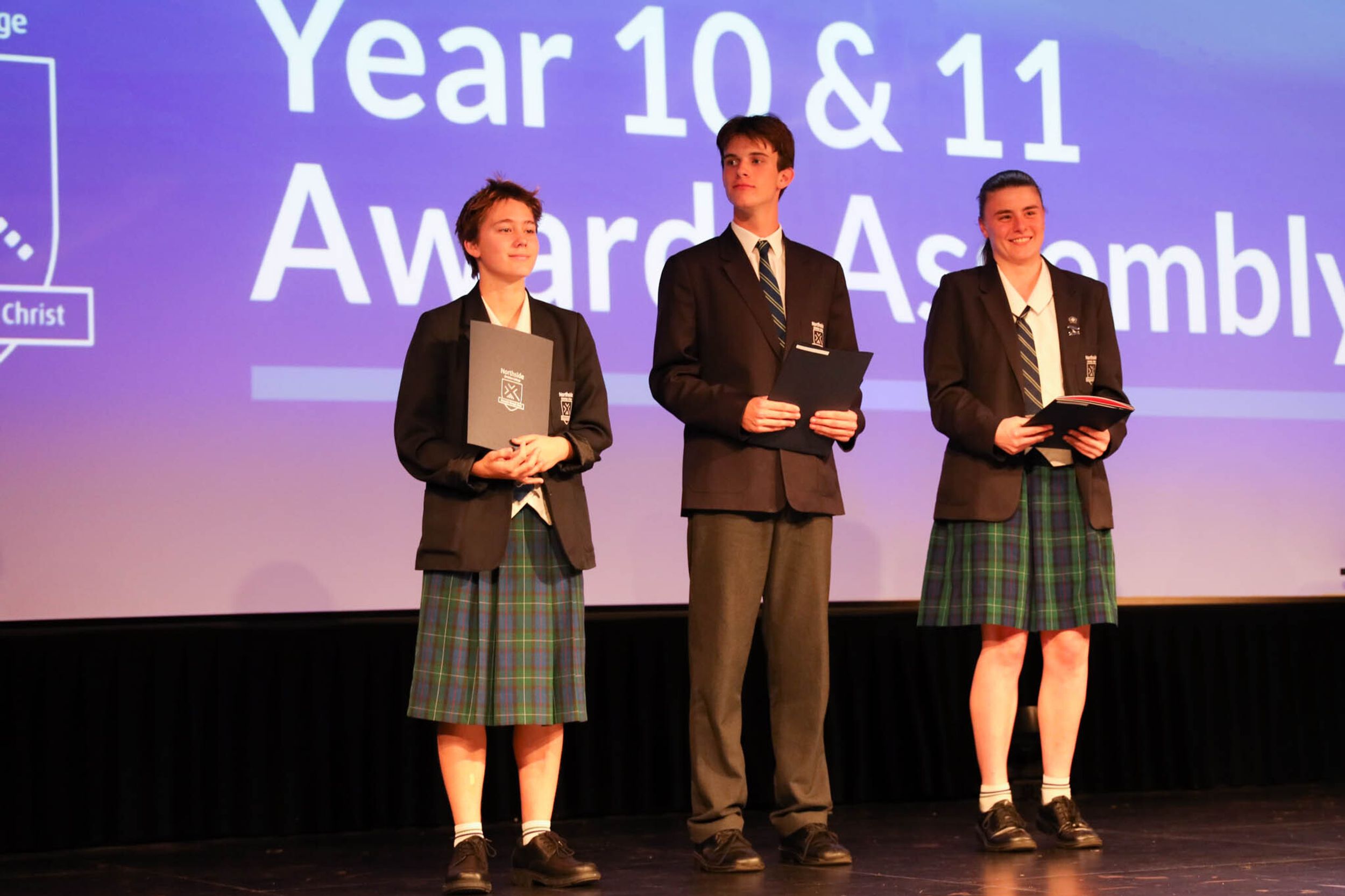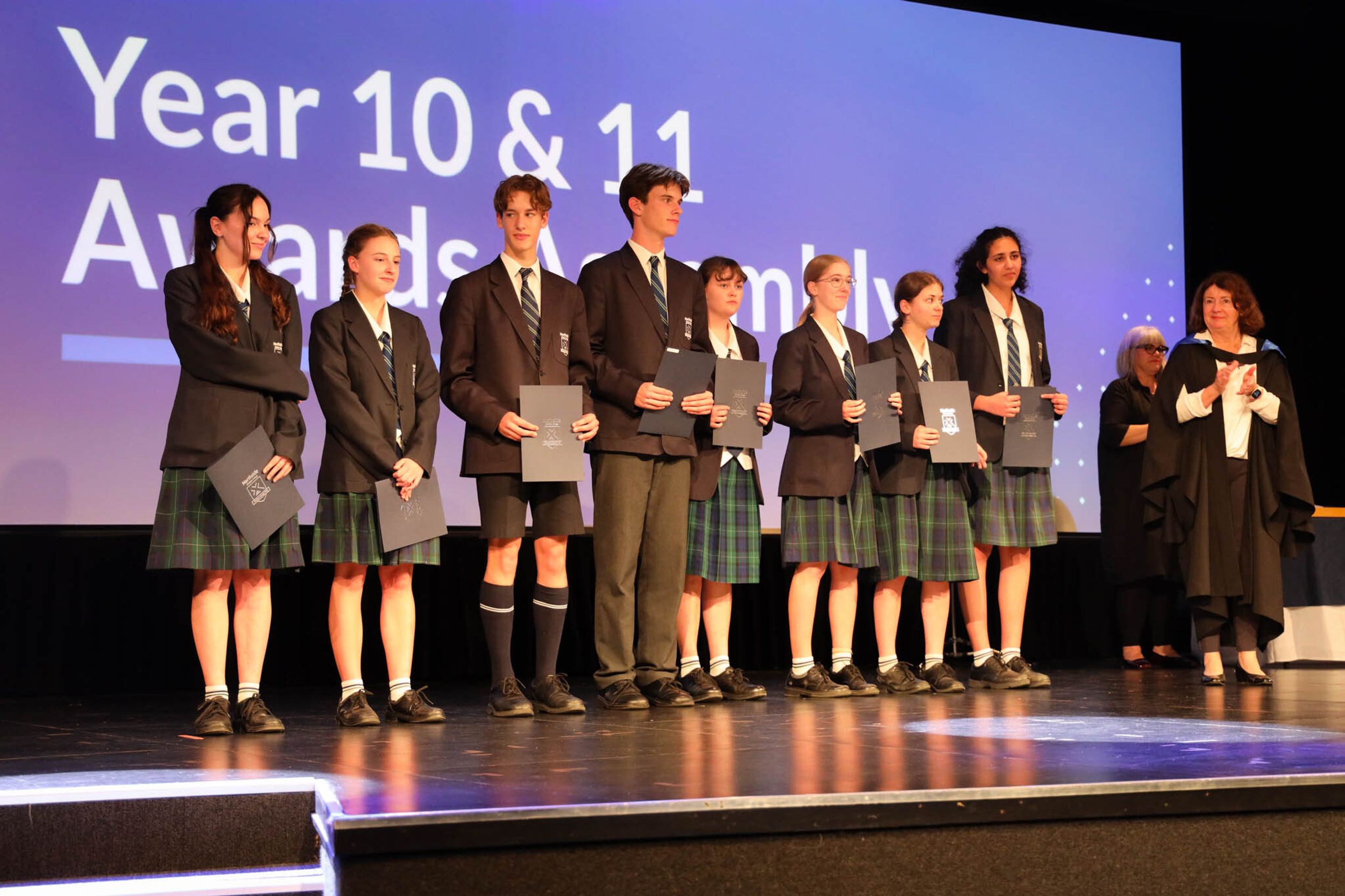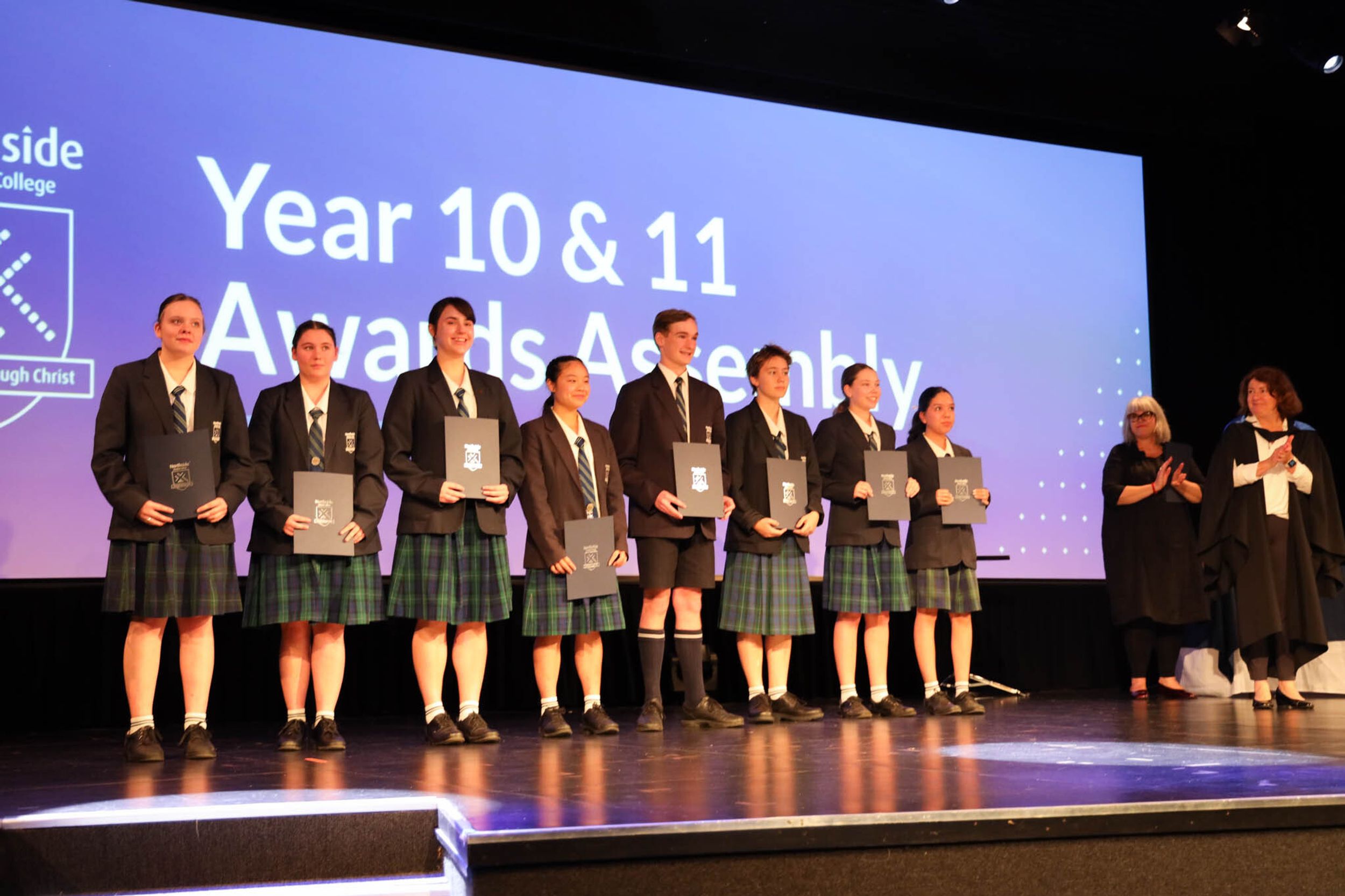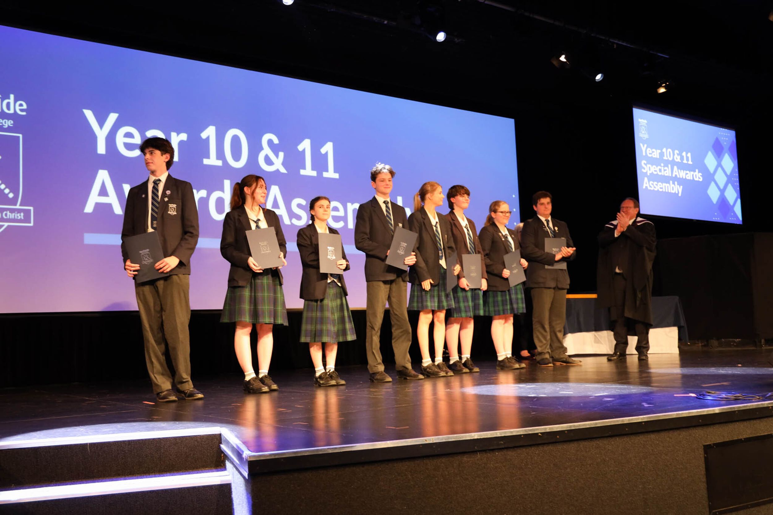 The College Captains thanked the students, staff, and parents for attending the Year 10 & 11 Awards Assembly. Year 9 students were especially welcomed as they attended their first Senior School Assembly. The top three achievers in each subject across years 10 and 11 were celebrated.