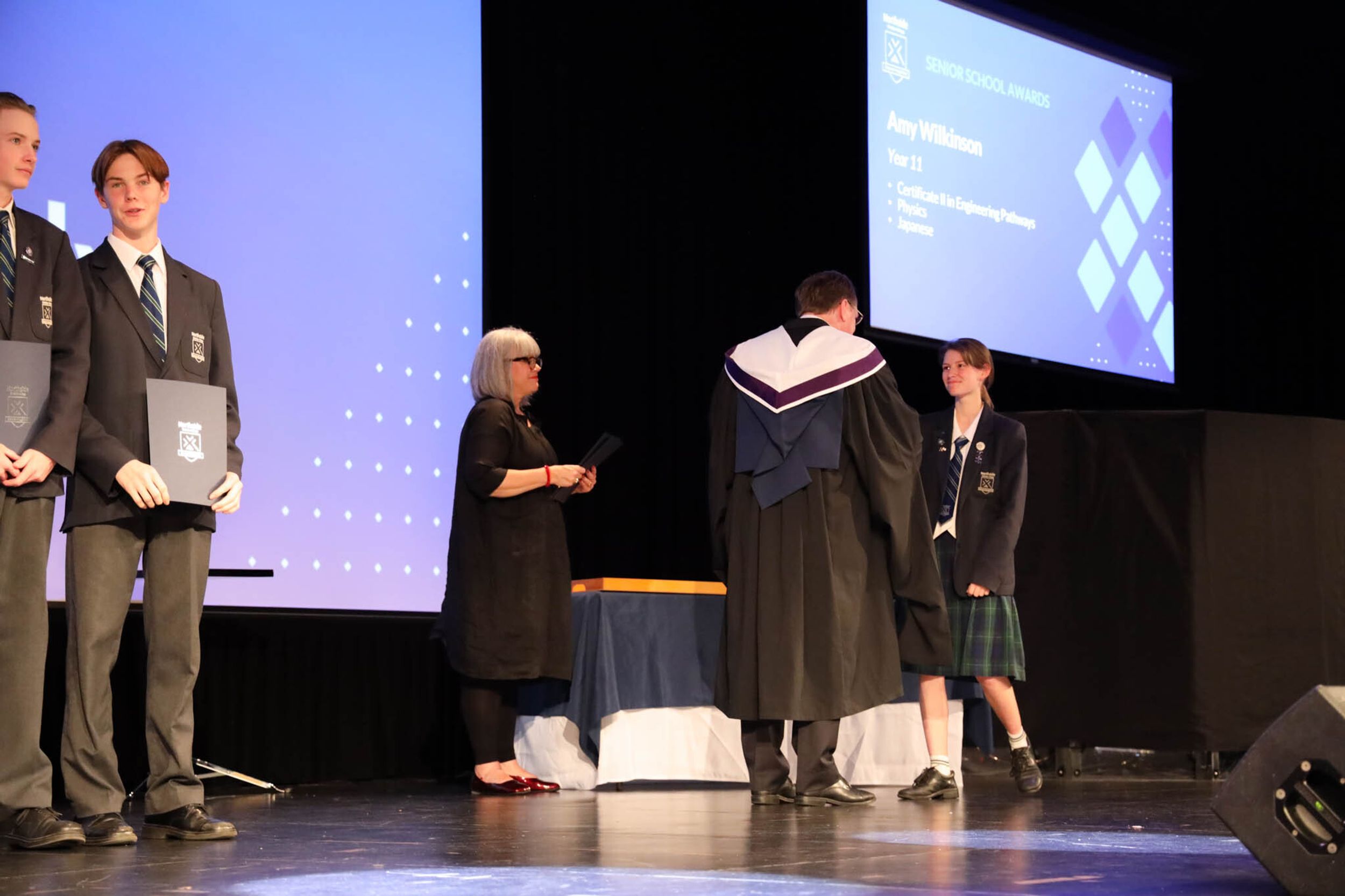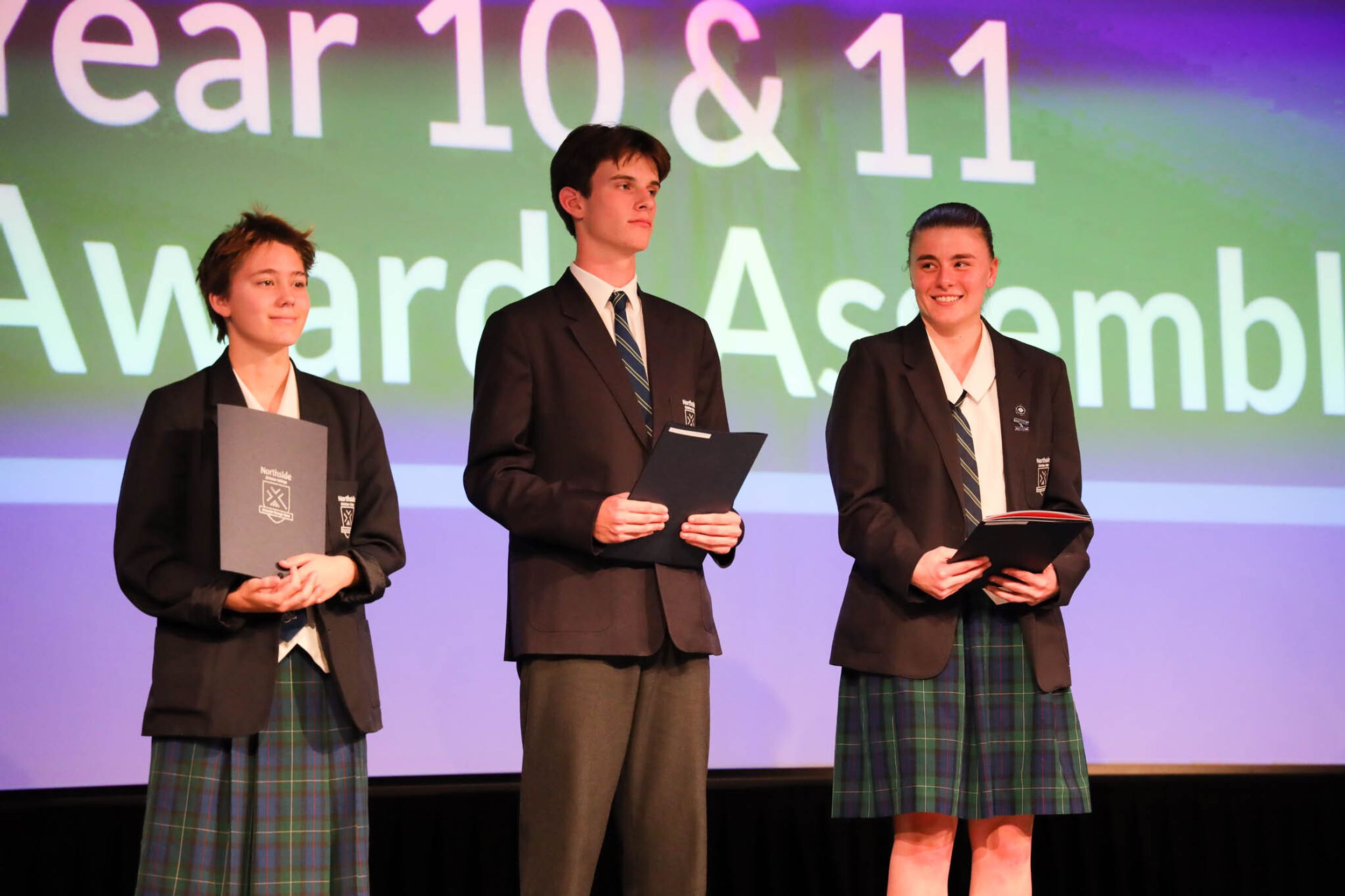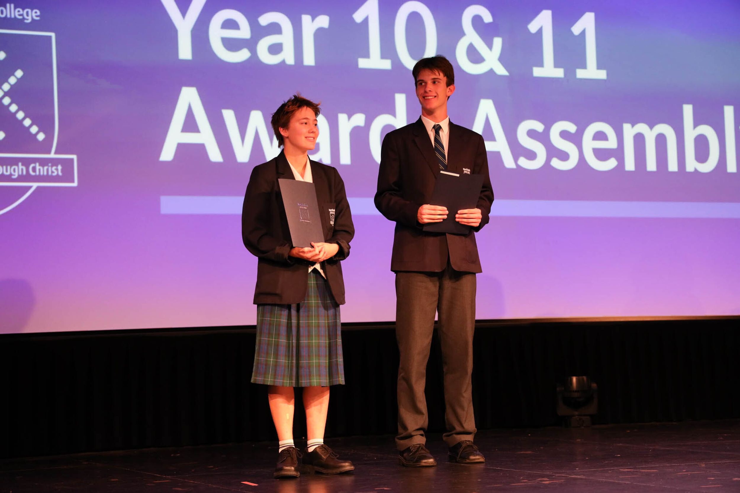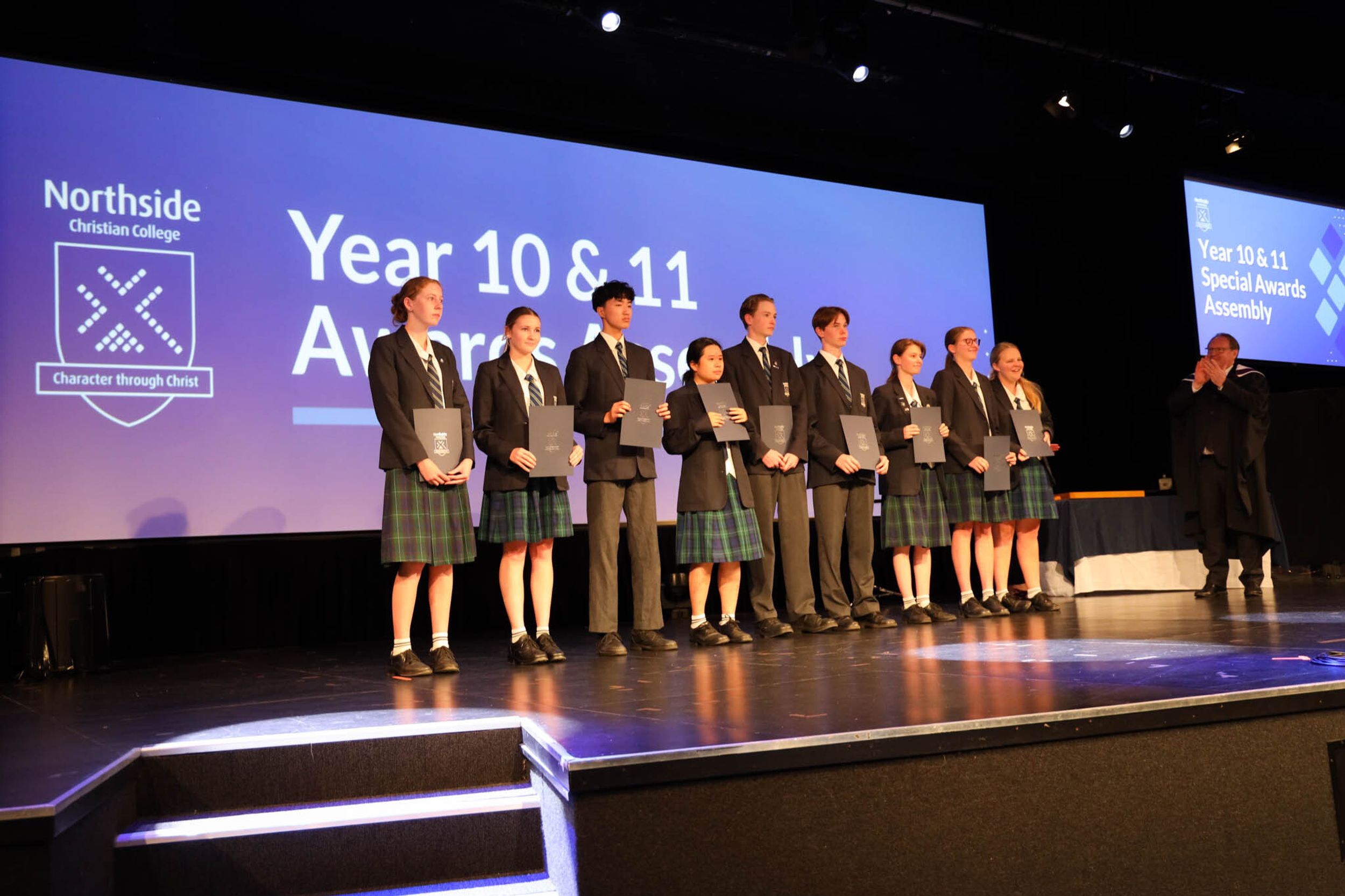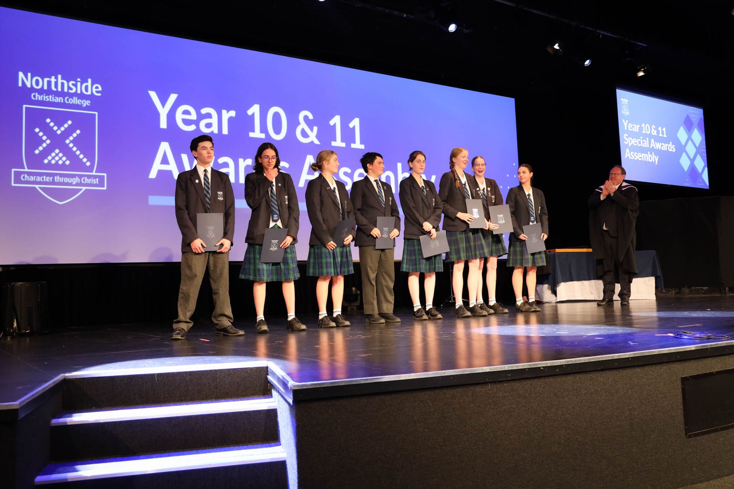 The College Captains thanked the students, staff, and parents for attending the Year 10 & 11 Awards Assembly. Year 9 students were especially welcomed as they attended their first Senior School Assembly. The top three achievers in each subject across years 10 and 11 were celebrated.
