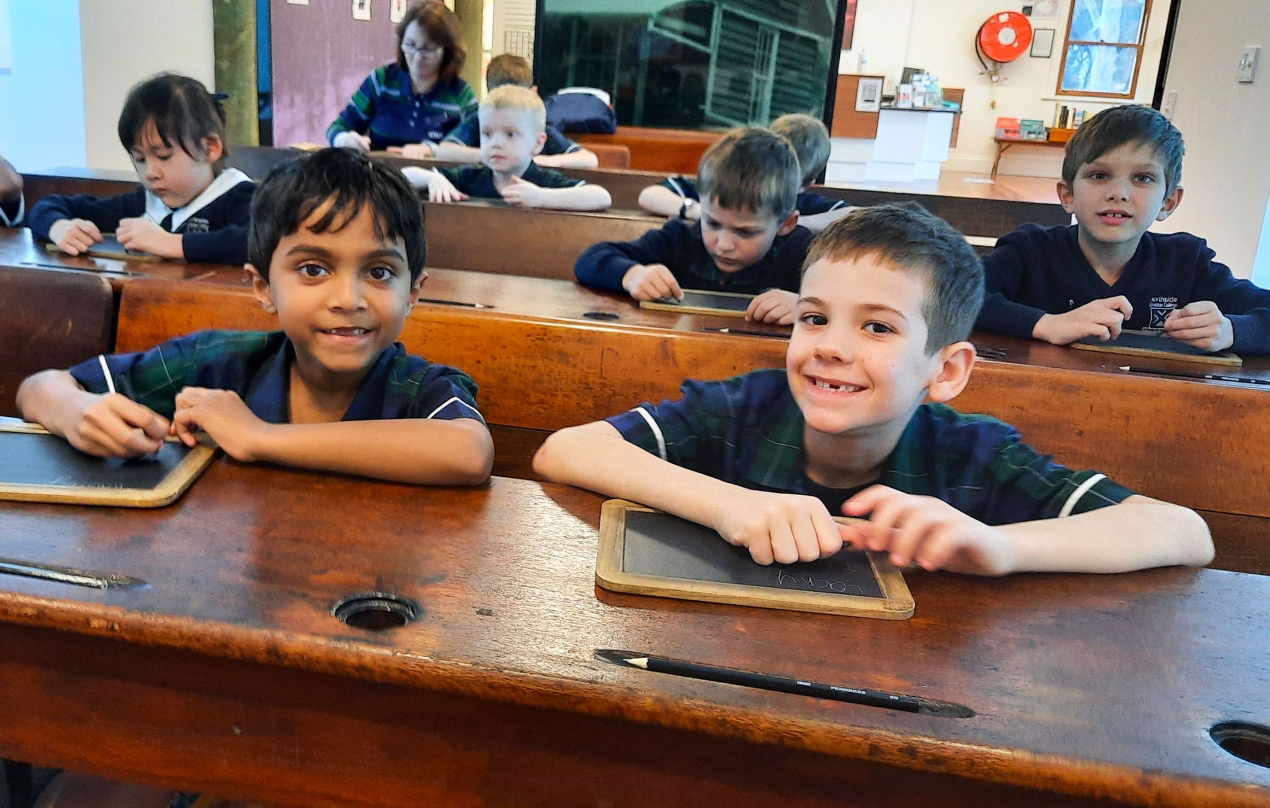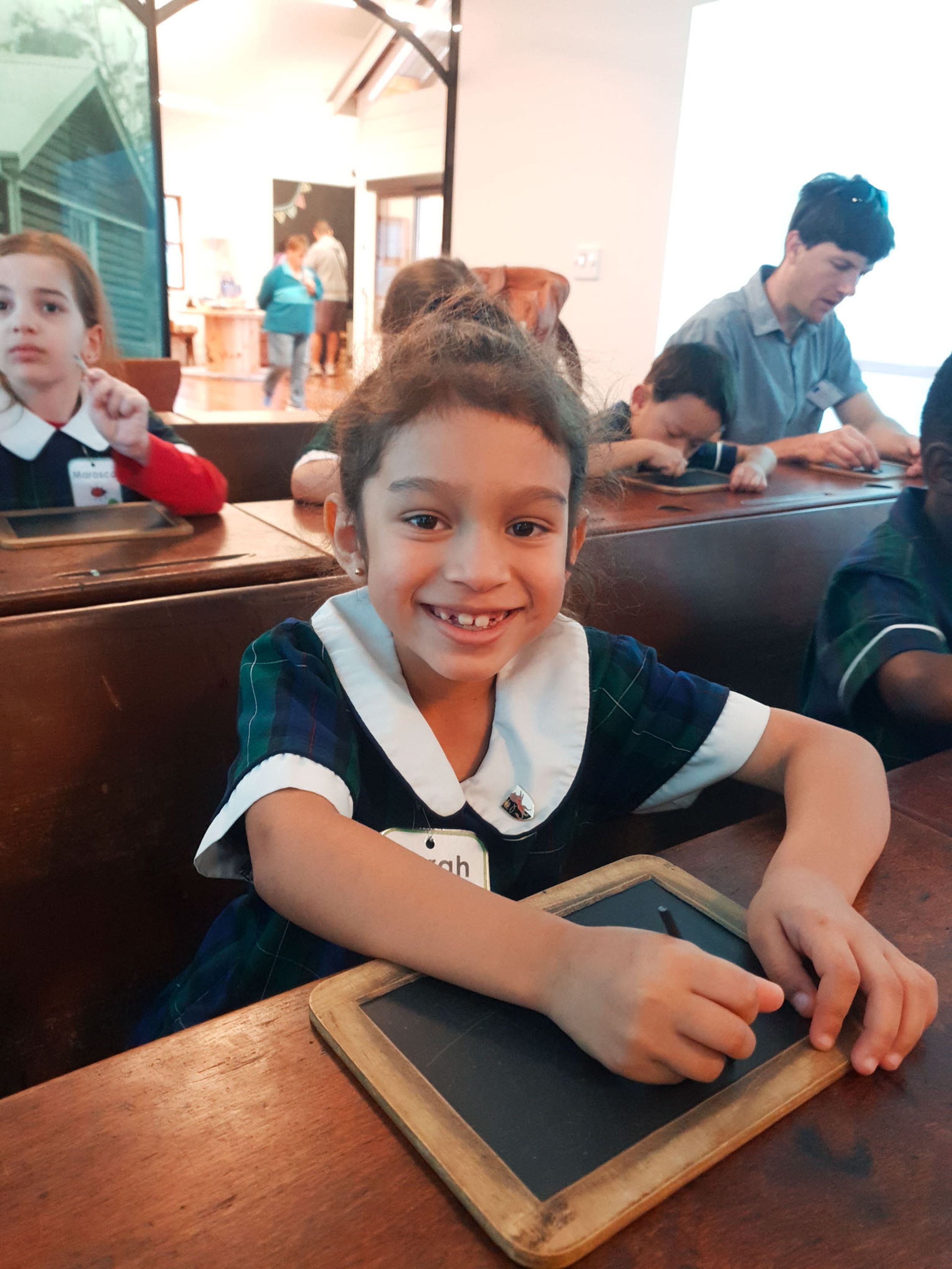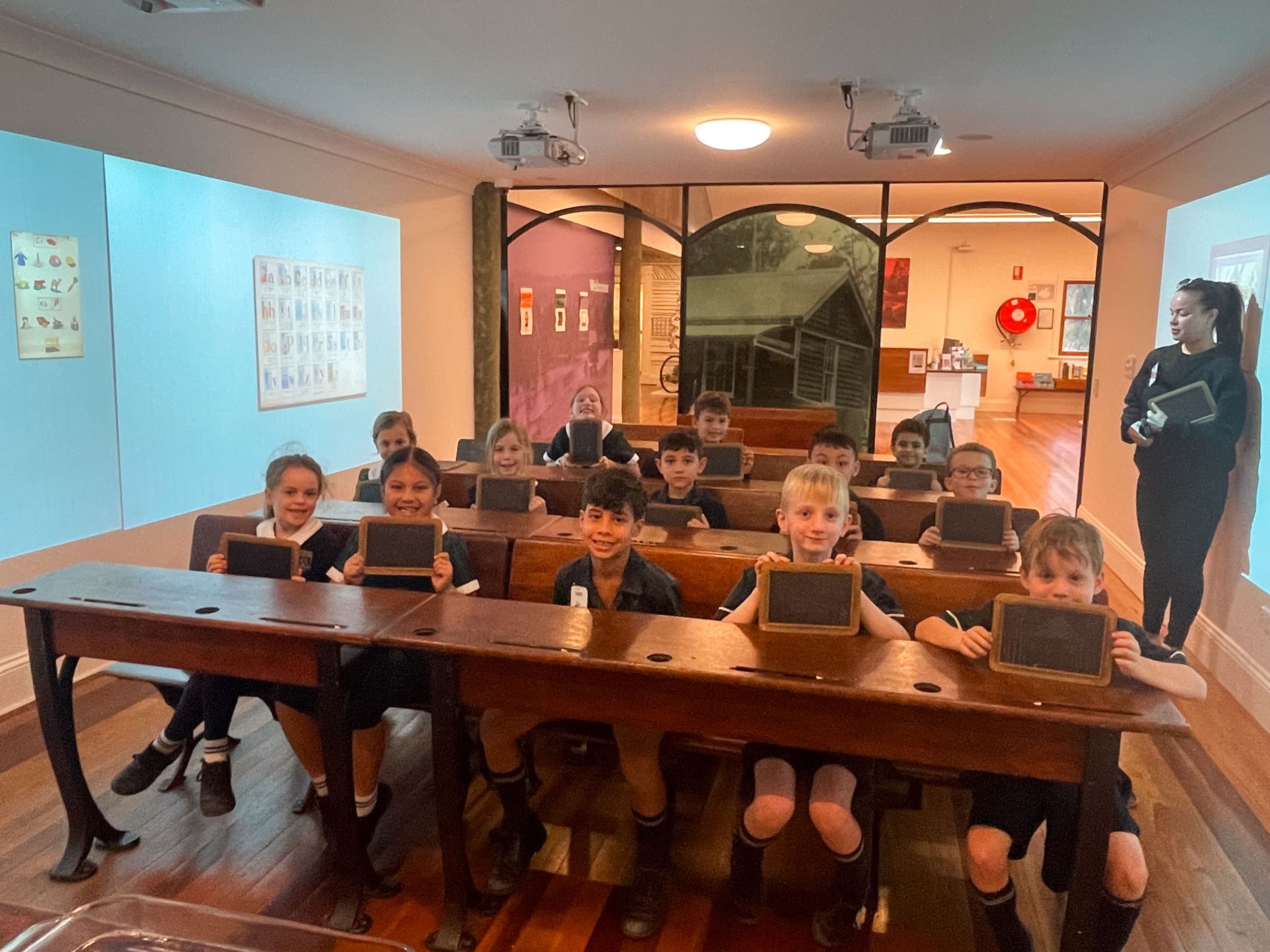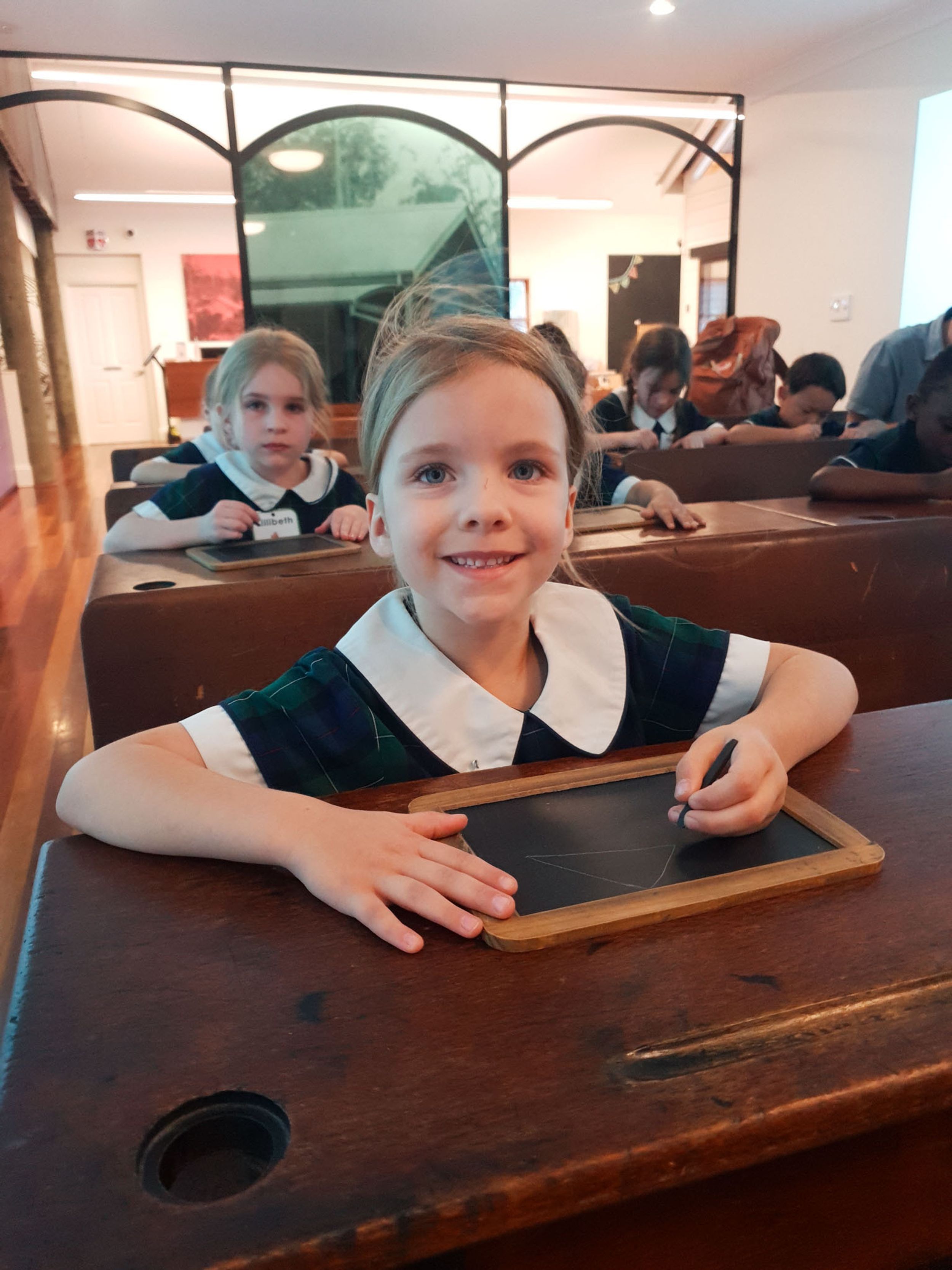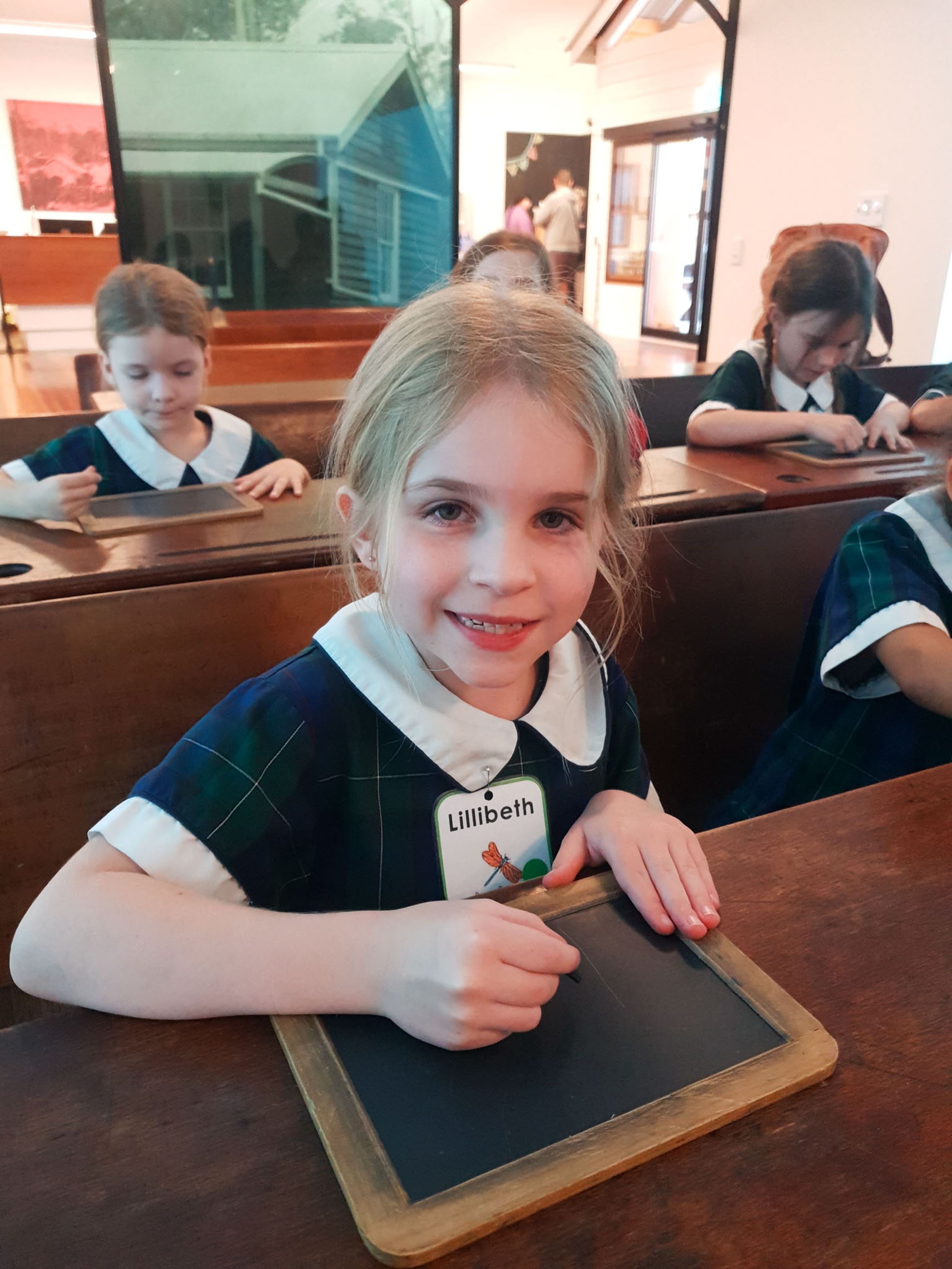 Year One students had an opportunity to take a step into the past on their recent excursion to the Pine Rivers Heritage Museum. After entering a 1950s classroom, they sat at long wooden desks, wrote on slates and helped to make worksheets using a hectograph (a process involving carbon paper and gelatin). Playing games from the past that incorporated jumping, rhymes and hula hoops provided much enjoyment. Many conversations and comparisons were made when they experienced 1950s life at dinner time, free from modern technology… watching a black and white TV show and making butter.