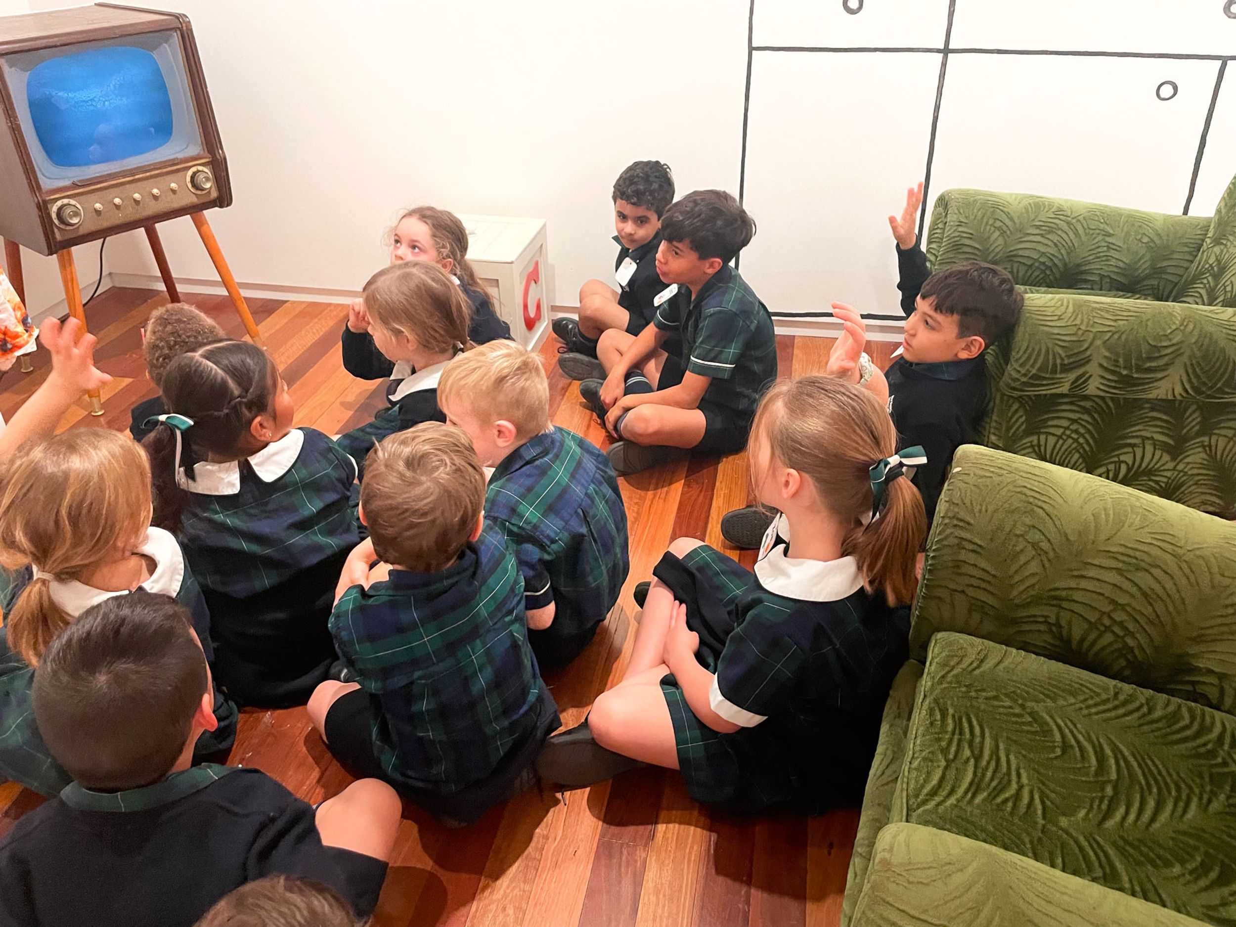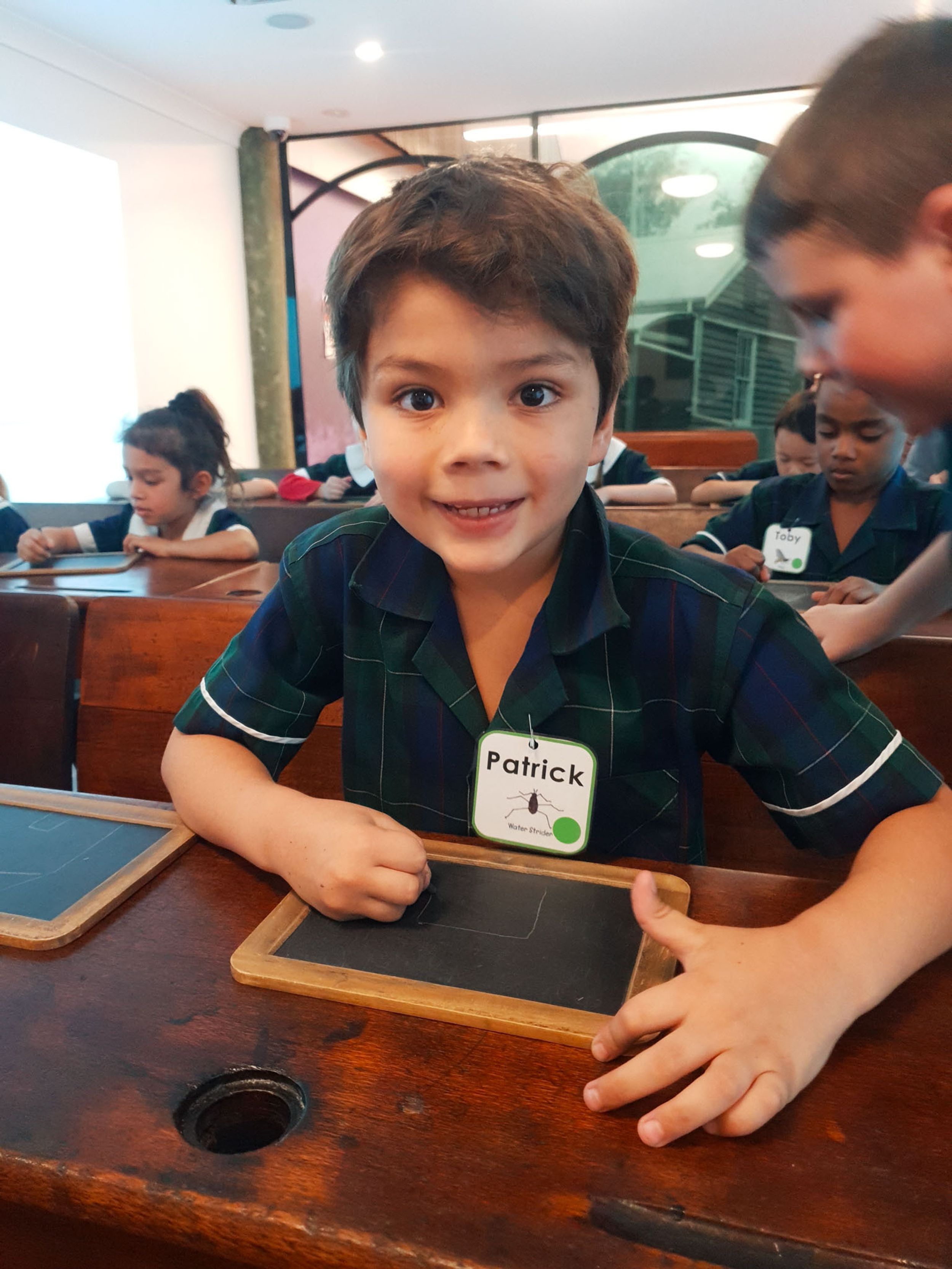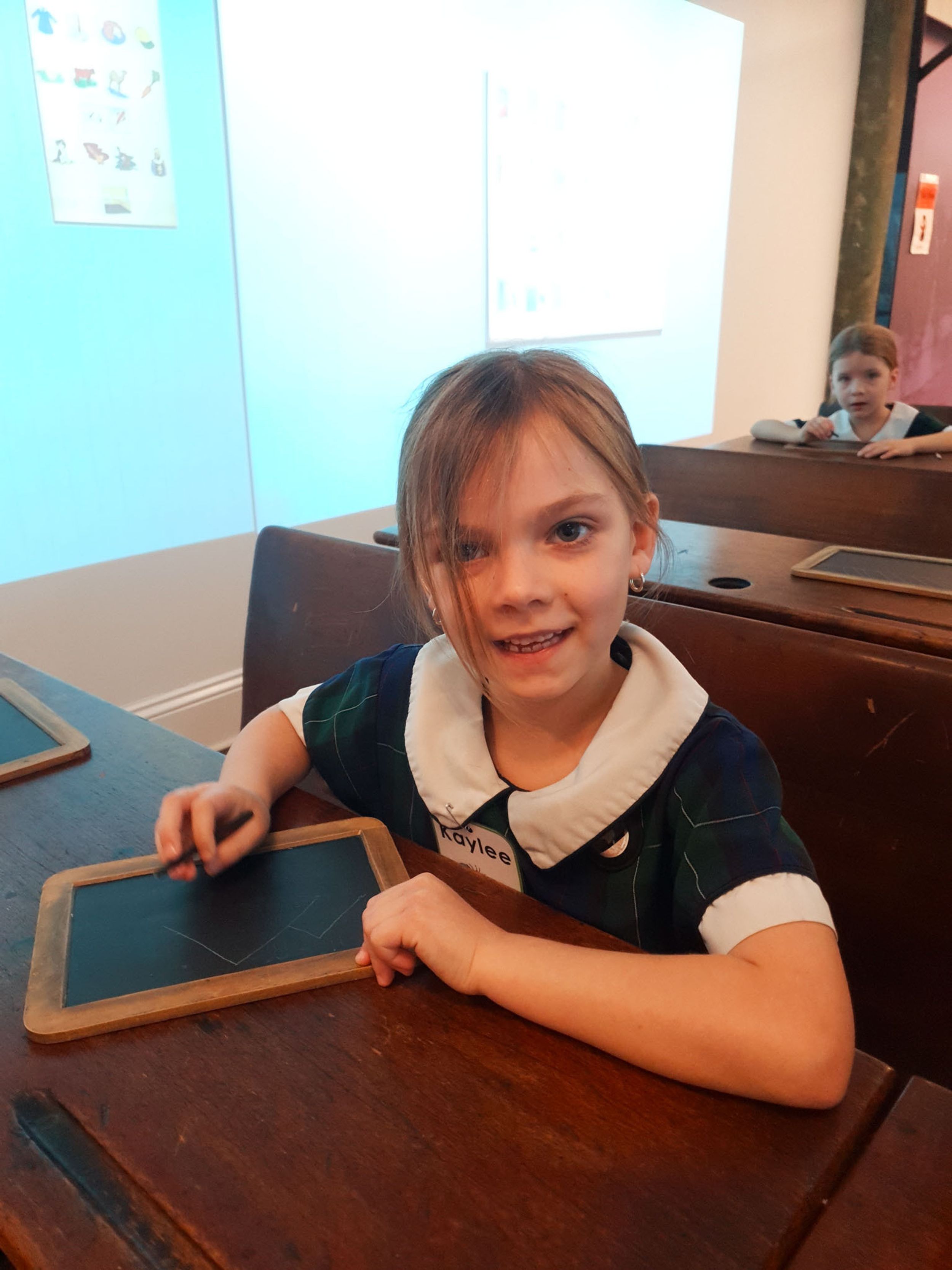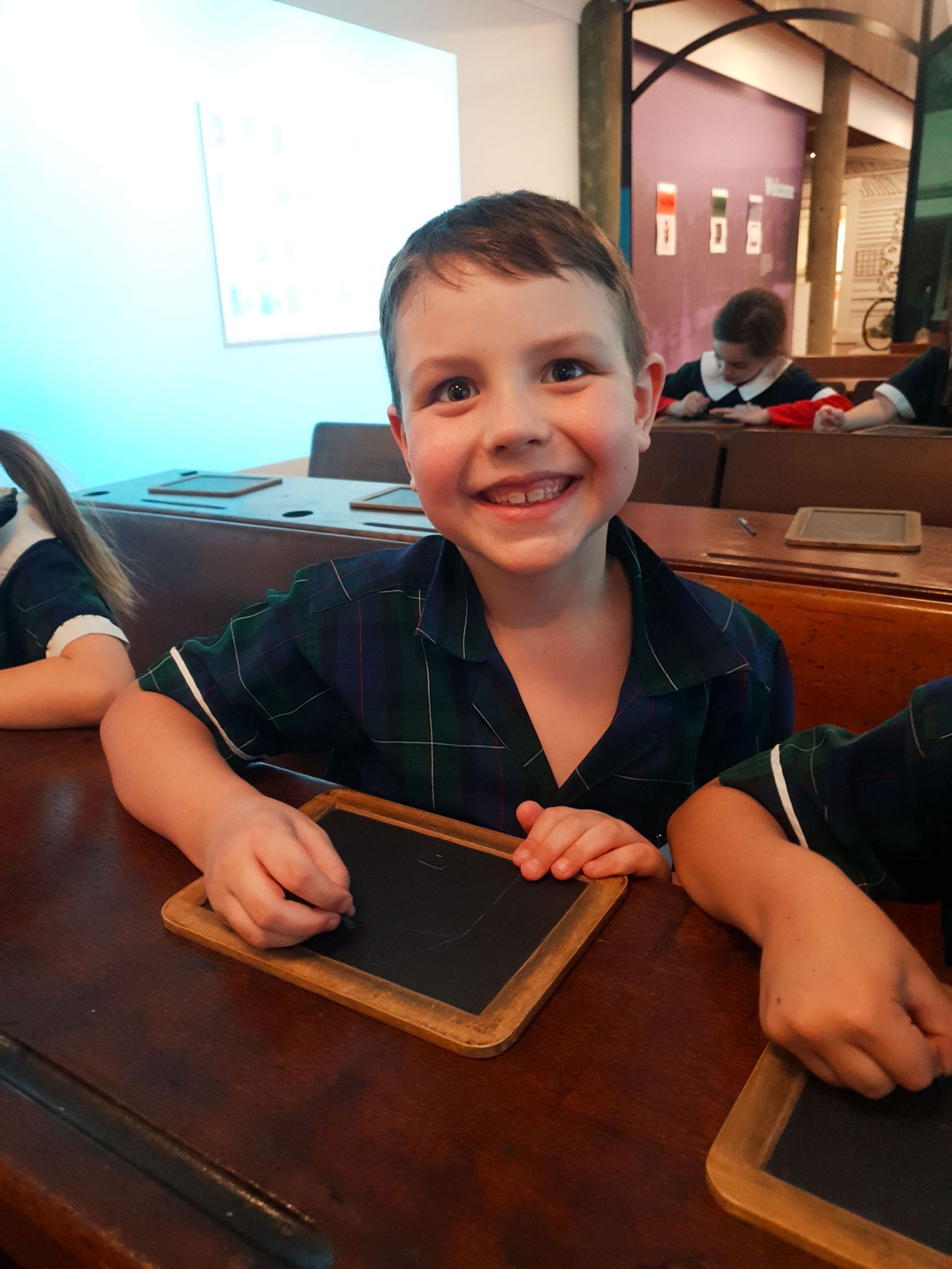 Year One students had an opportunity to take a step into the past on their recent excursion to the Pine Rivers Heritage Museum. After entering a 1950s classroom, they sat at long wooden desks, wrote on slates and helped to make worksheets using a hectograph (a process involving carbon paper and gelatin). Playing games from the past that incorporated jumping, rhymes and hula hoops provided much enjoyment. Many conversations and comparisons were made when they experienced 1950s life at dinner time, free from modern technology… watching a black and white TV show and making butter.