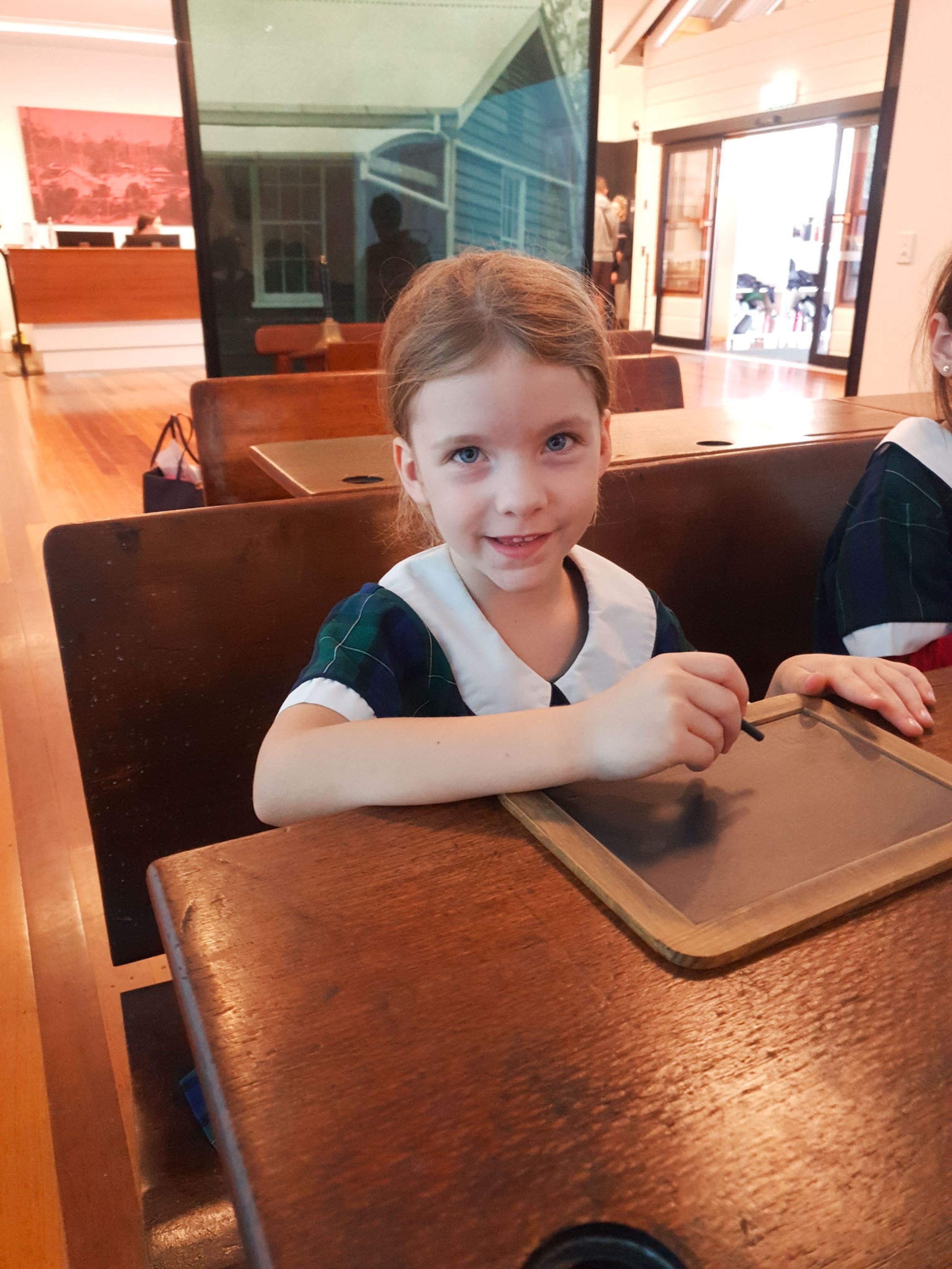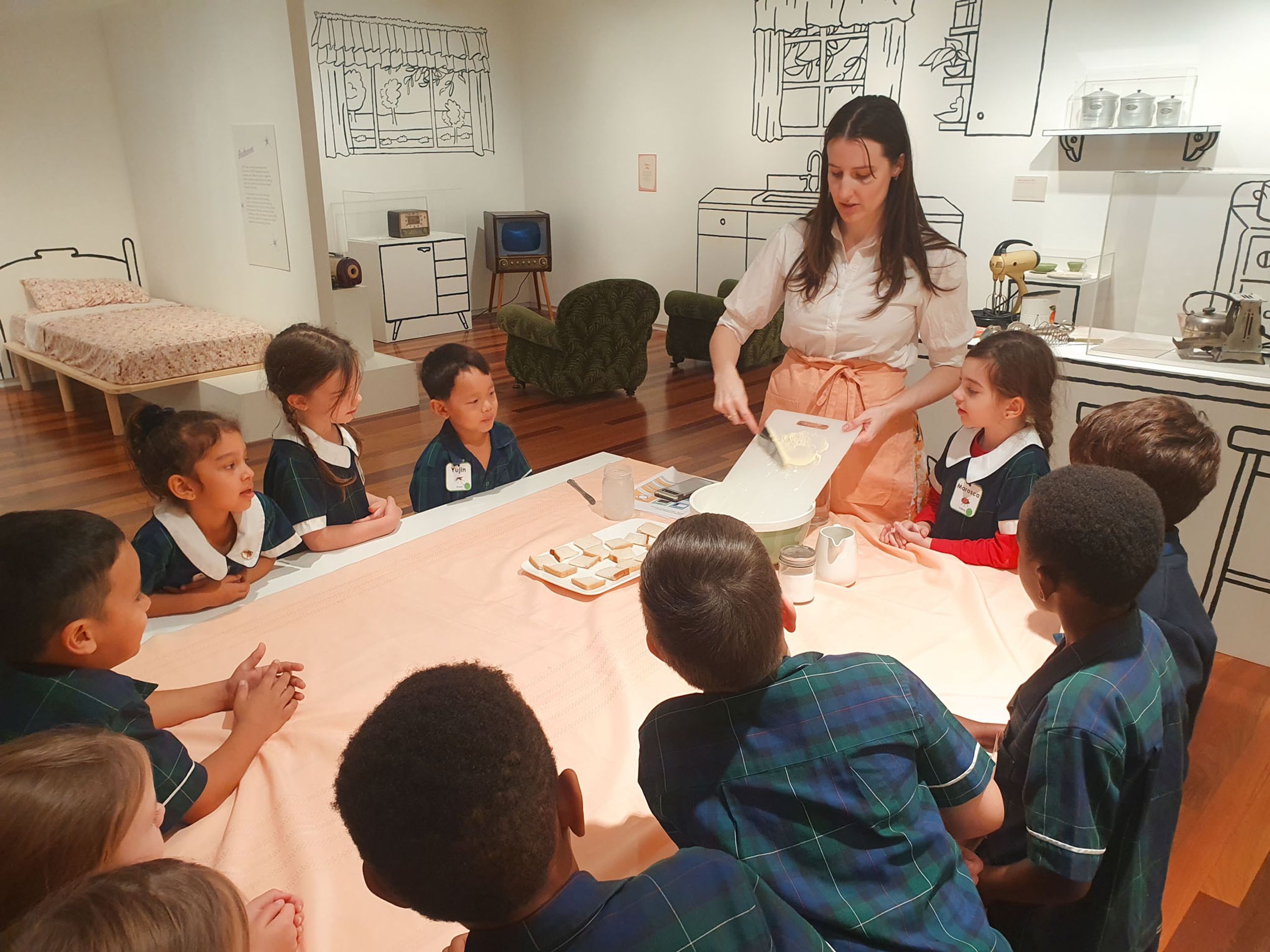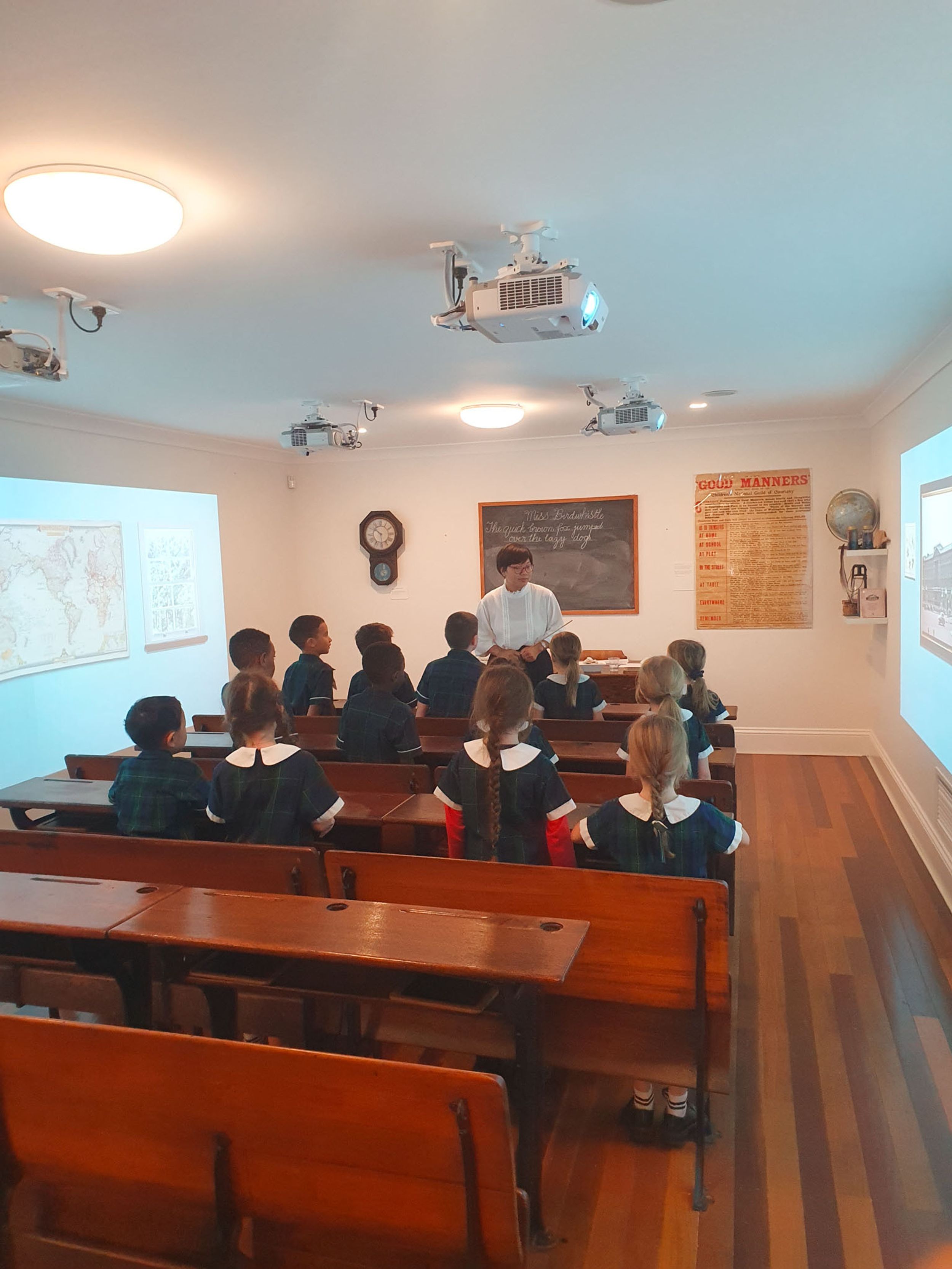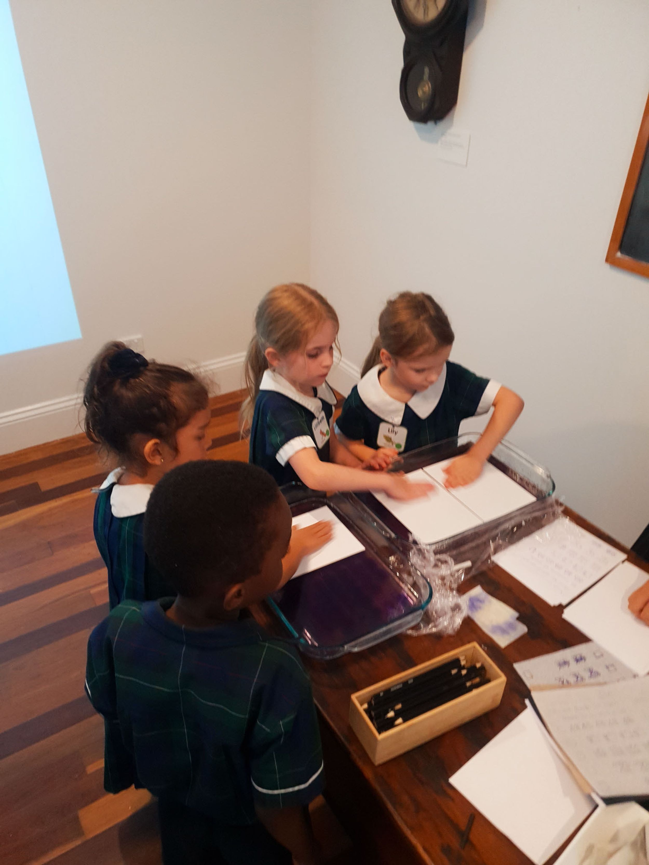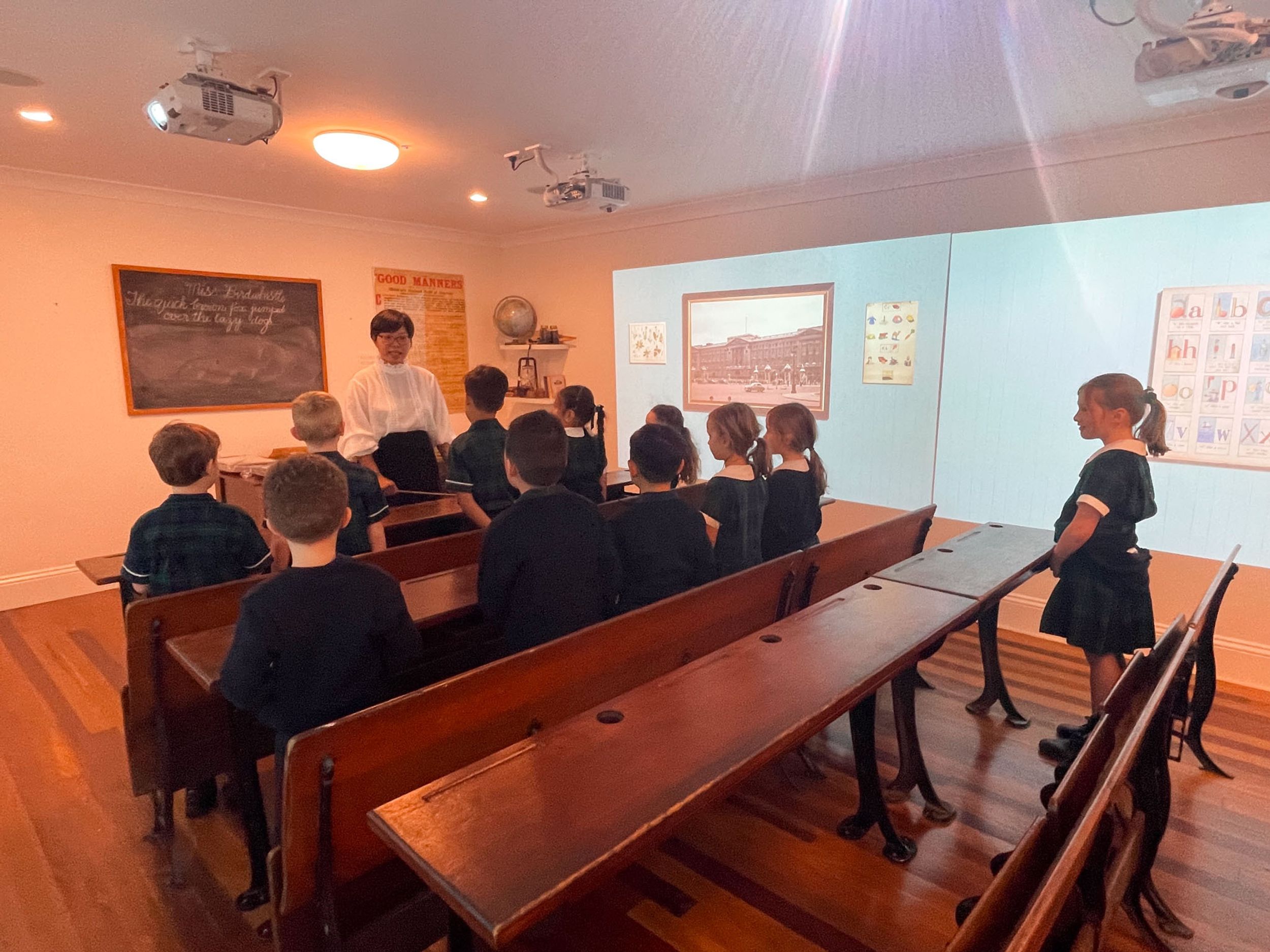 Year One students had an opportunity to take a step into the past on their recent excursion to the Pine Rivers Heritage Museum. After entering a 1950s classroom, they sat at long wooden desks, wrote on slates and helped to make worksheets using a hectograph (a process involving carbon paper and gelatin). Playing games from the past that incorporated jumping, rhymes and hula hoops provided much enjoyment. Many conversations and comparisons were made when they experienced 1950s life at dinner time, free from modern technology… watching a black and white TV show and making butter.