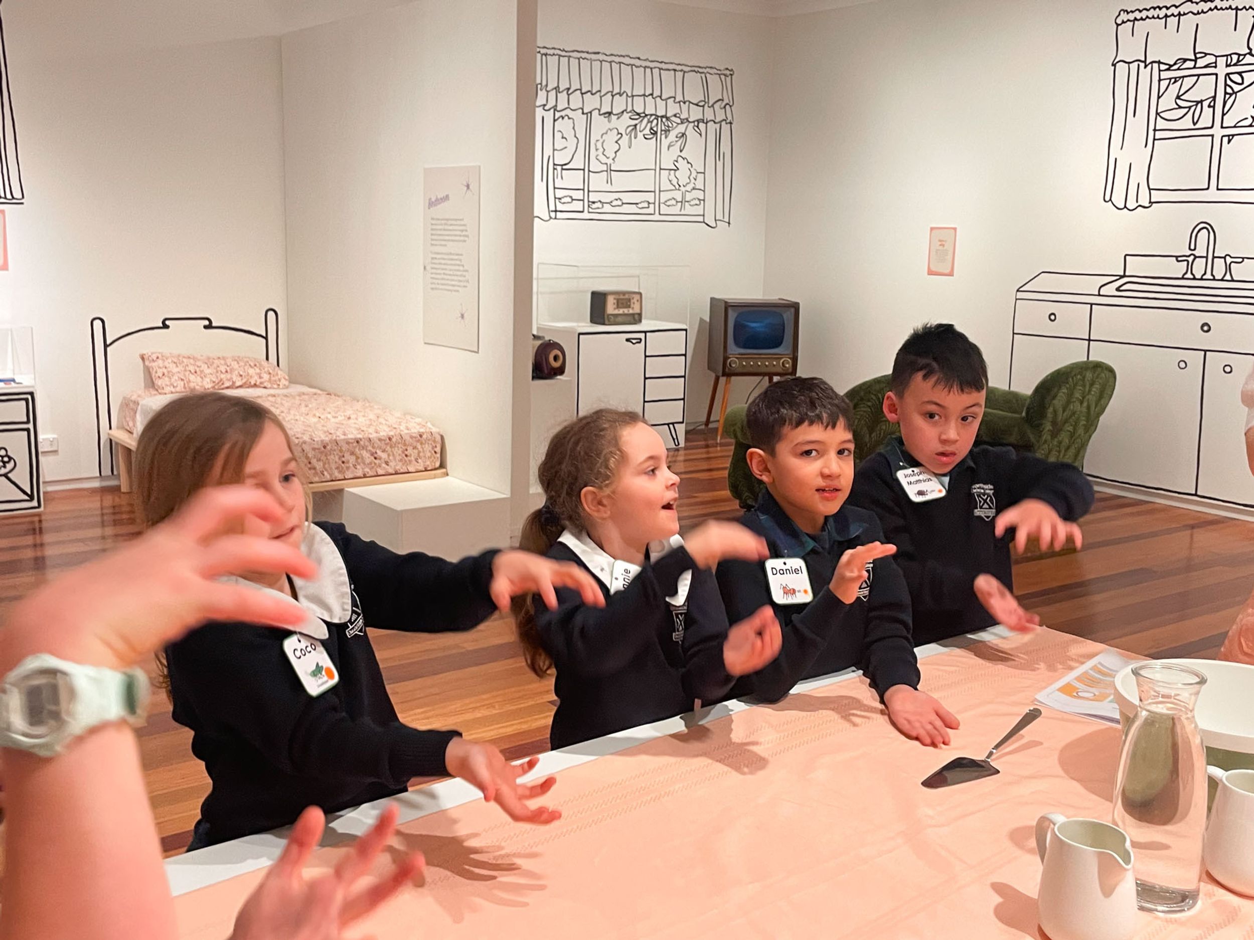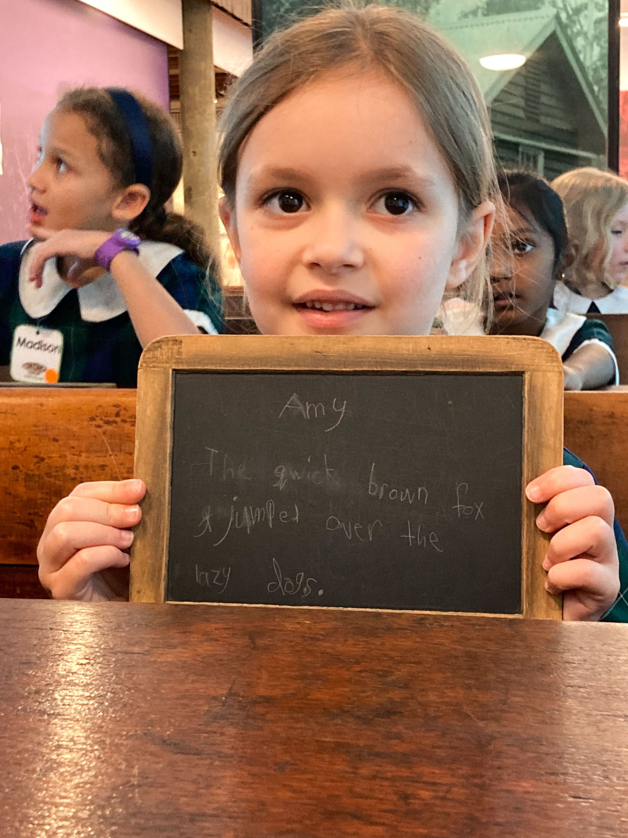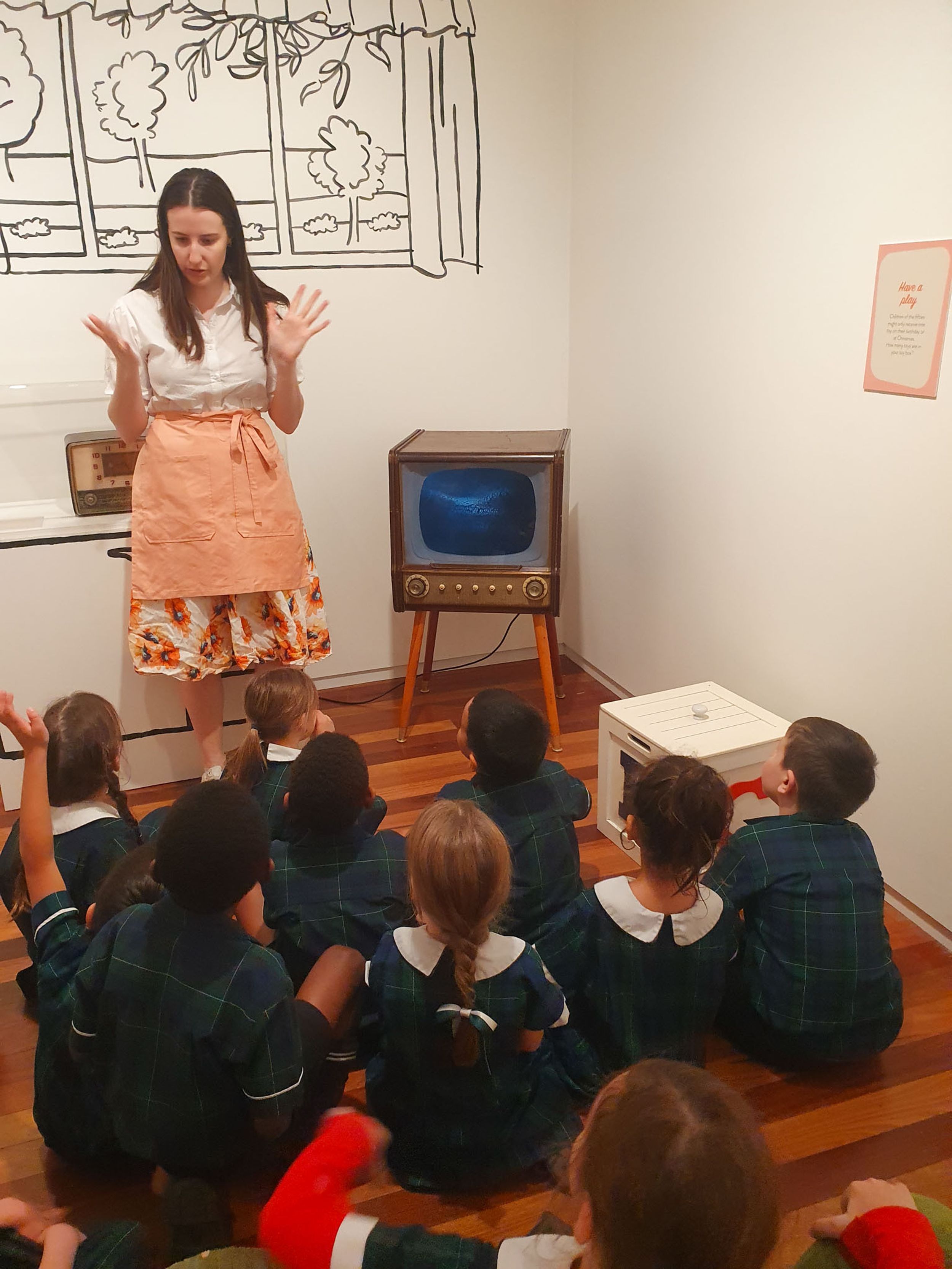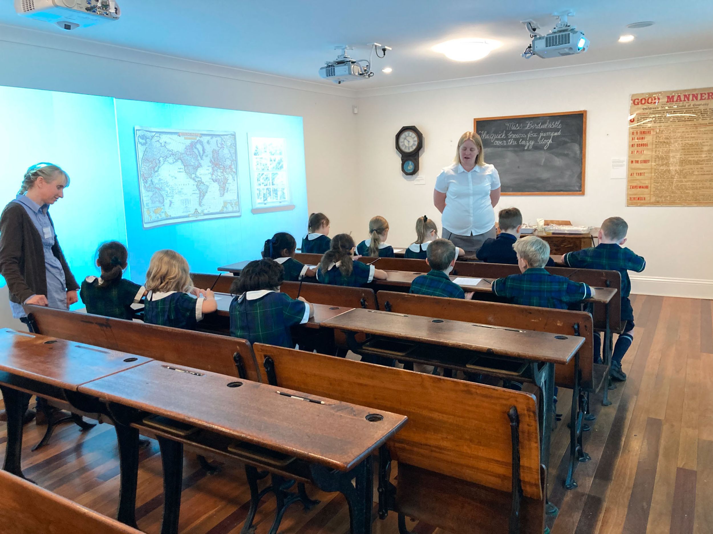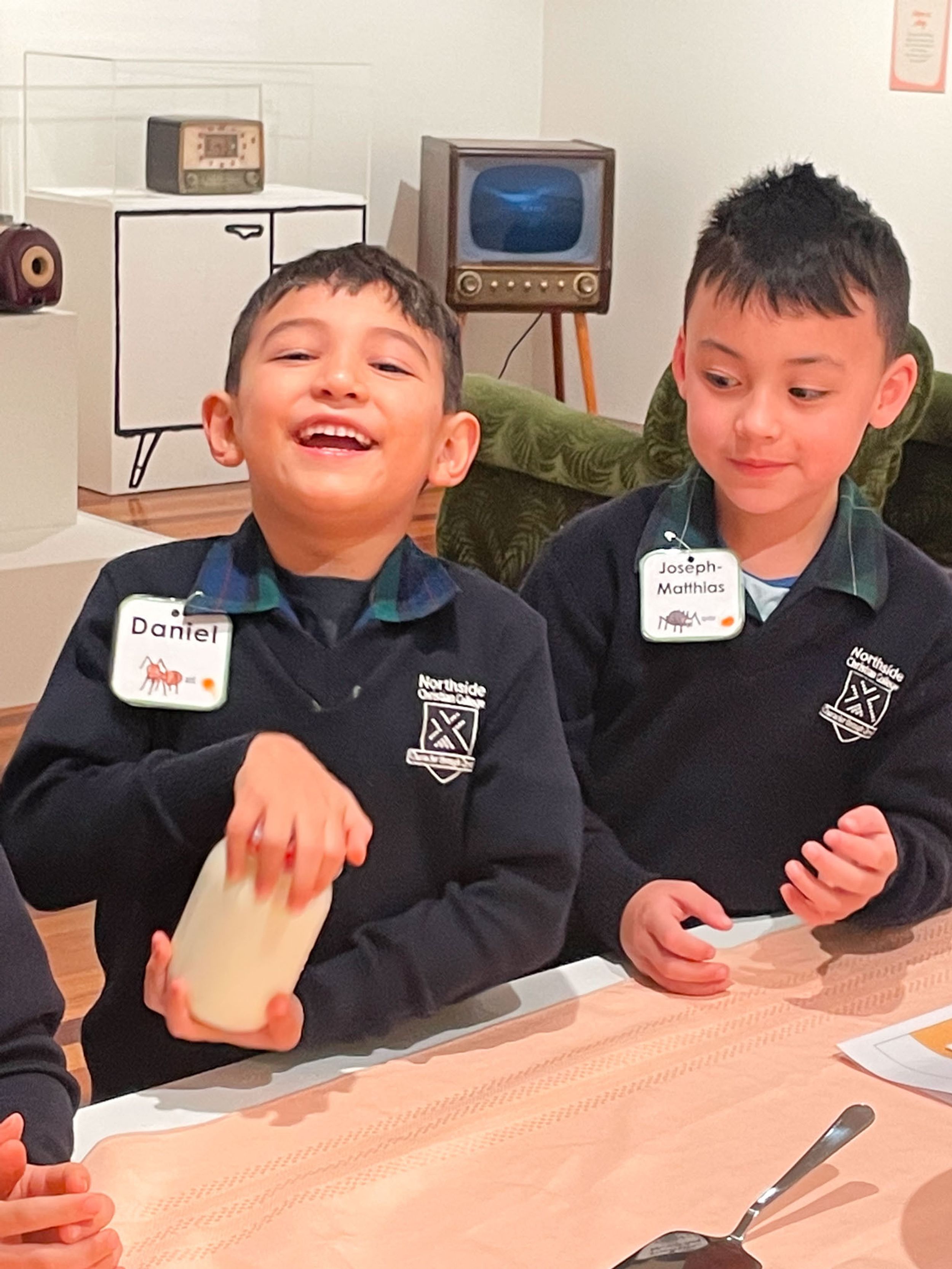 Year One students had an opportunity to take a step into the past on their recent excursion to the Pine Rivers Heritage Museum. After entering a 1950s classroom, they sat at long wooden desks, wrote on slates and helped to make worksheets using a hectograph (a process involving carbon paper and gelatin). Playing games from the past that incorporated jumping, rhymes and hula hoops provided much enjoyment. Many conversations and comparisons were made when they experienced 1950s life at dinner time, free from modern technology… watching a black and white TV show and making butter.