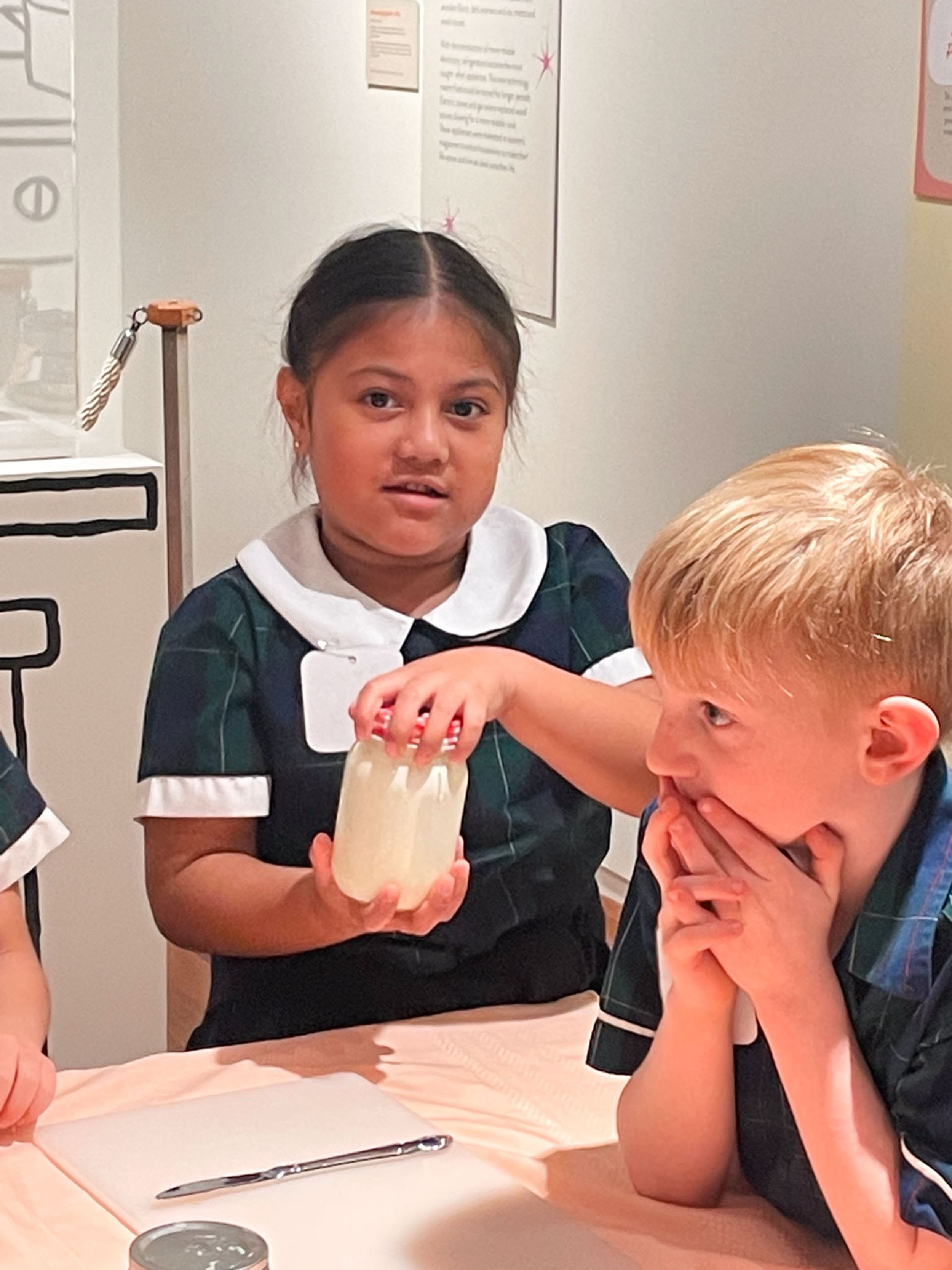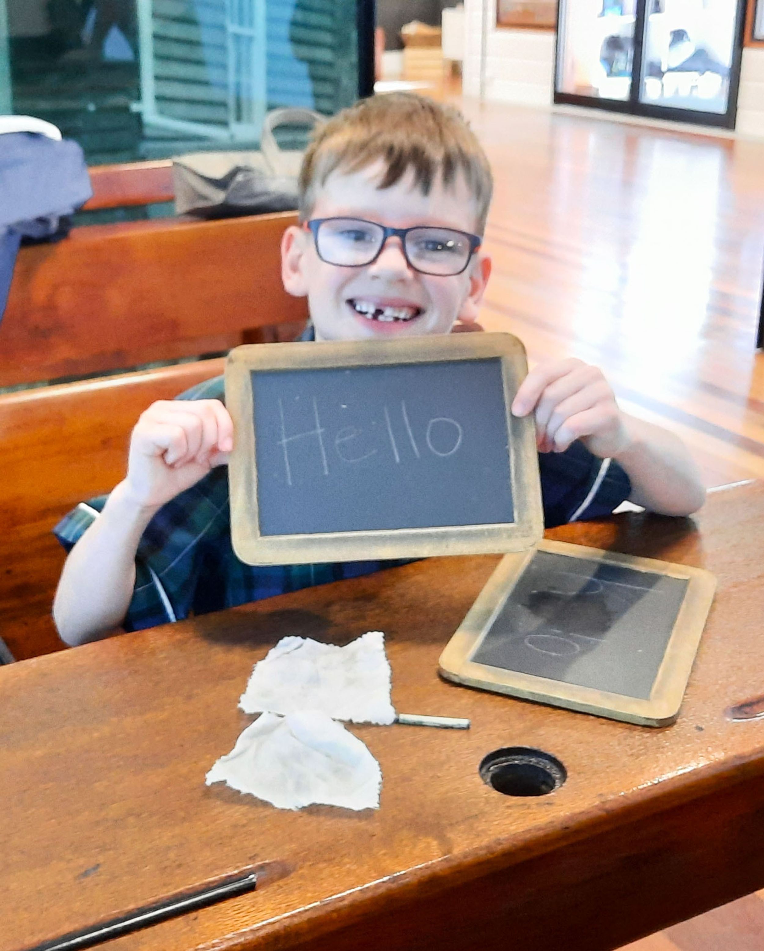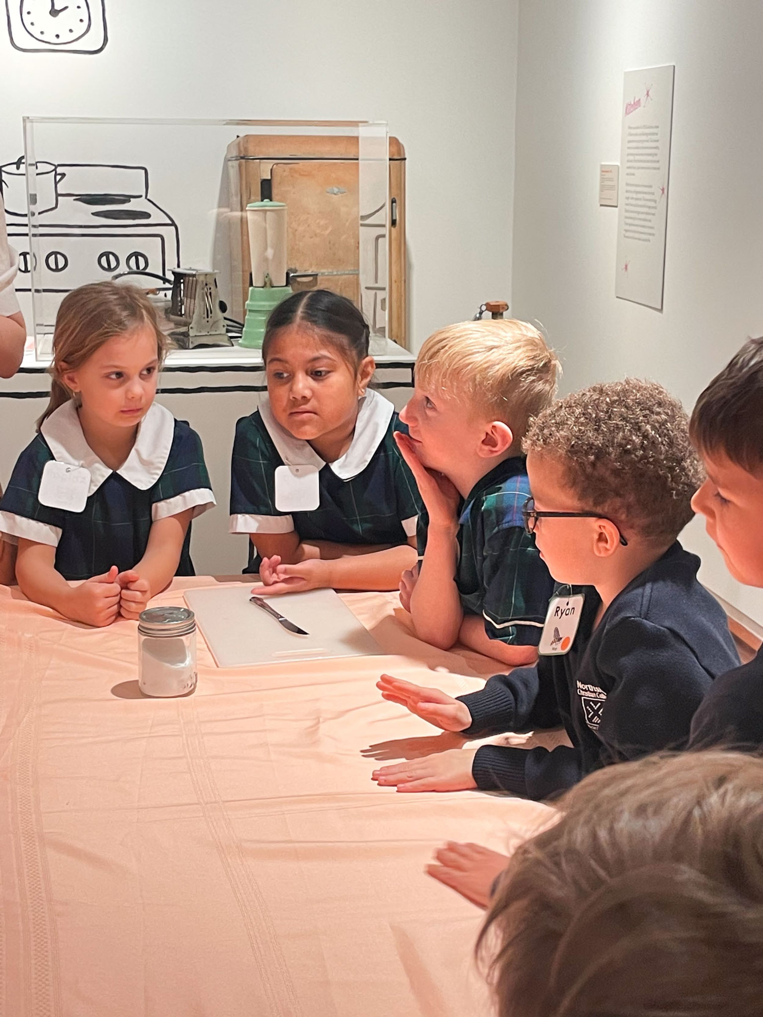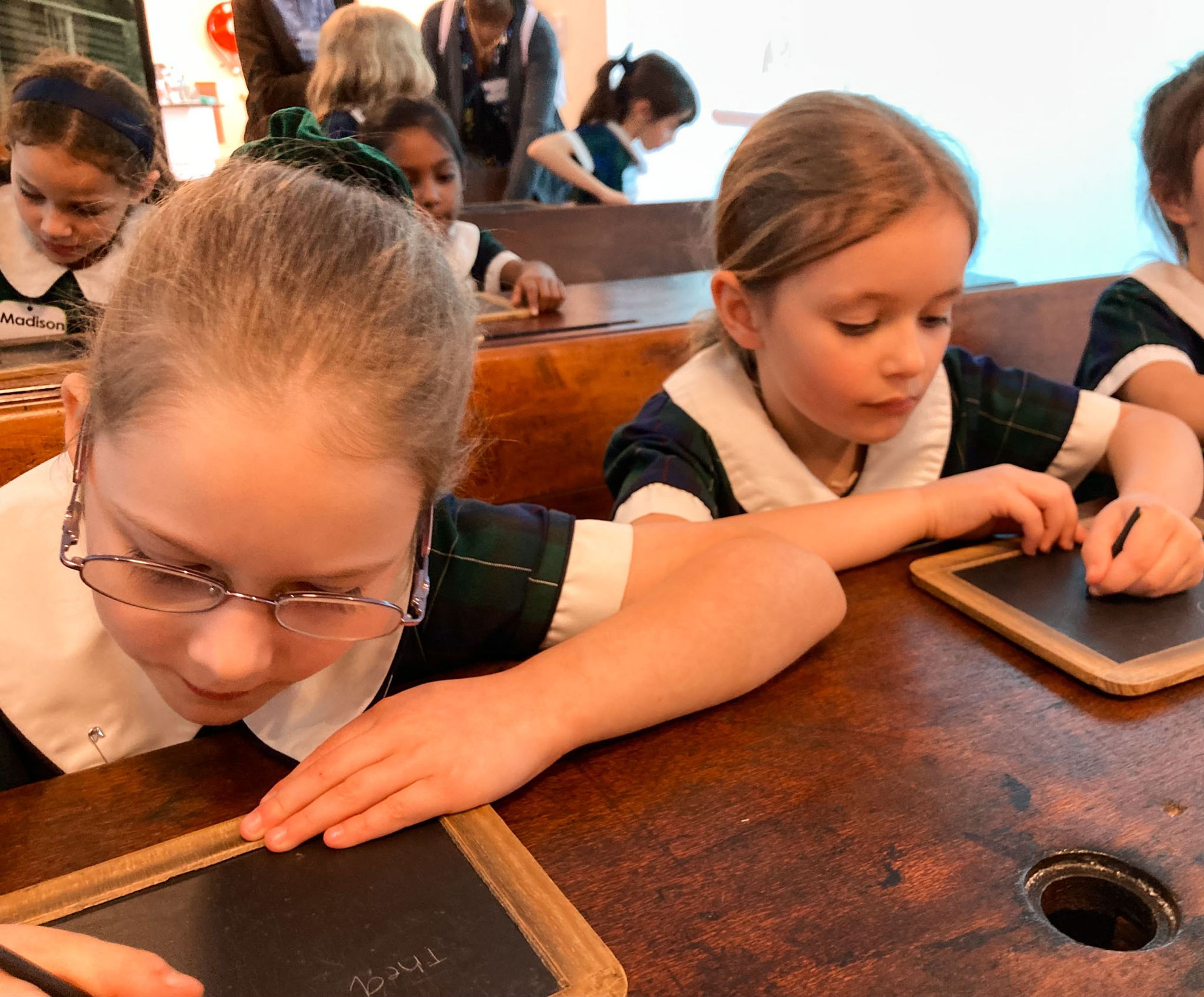 Year One students had an opportunity to take a step into the past on their recent excursion to the Pine Rivers Heritage Museum. After entering a 1950s classroom, they sat at long wooden desks, wrote on slates and helped to make worksheets using a hectograph (a process involving carbon paper and gelatin). Playing games from the past that incorporated jumping, rhymes and hula hoops provided much enjoyment. Many conversations and comparisons were made when they experienced 1950s life at dinner time, free from modern technology… watching a black and white TV show and making butter.